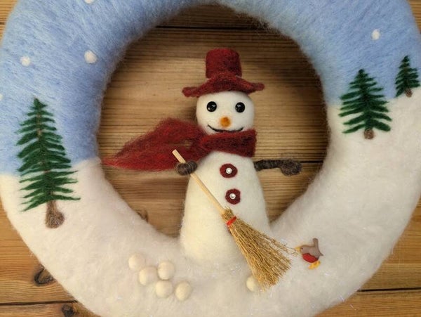 This is a decorative winter-themed wreath made of felted wool. The design features: