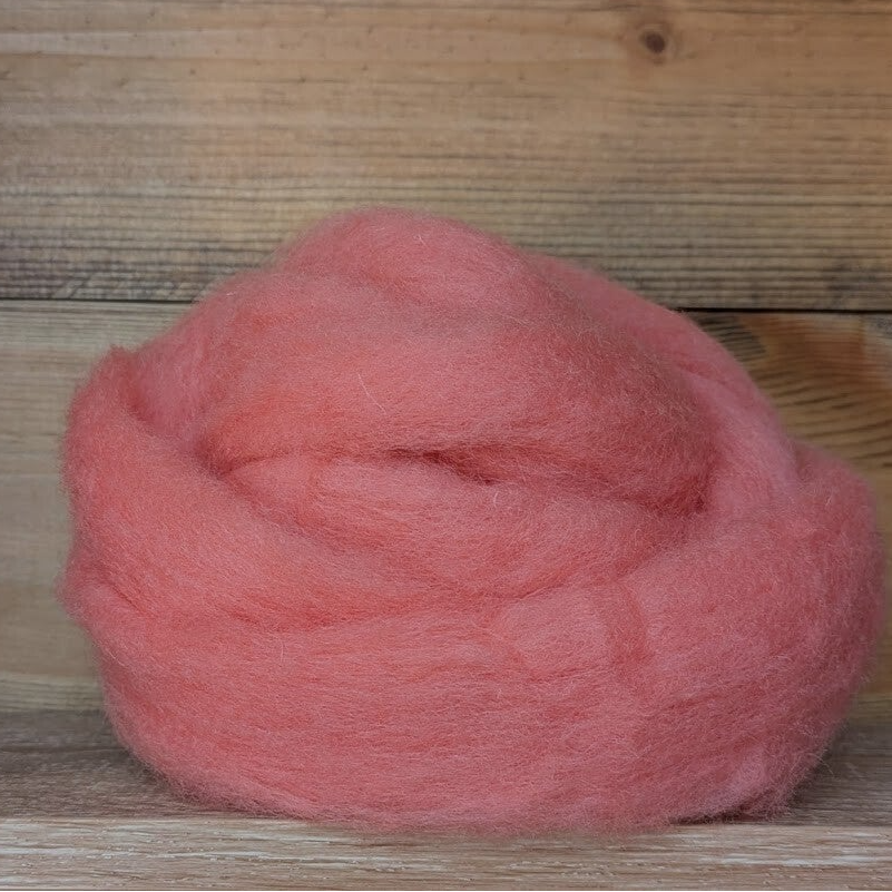 Pinky-peach corriedale carded wool sliver , which is a continuous, untwisted rope of wool fibers. It has a soft, fluffy, and even texture, which results from the carding process. Great for all kinds of felting, spinning and other textile crafts