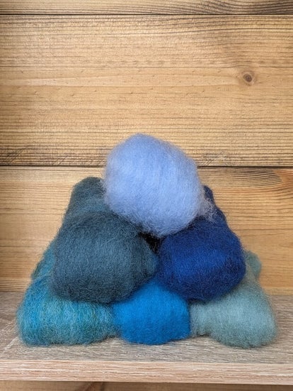Pack of six different colours of carded slivers, approximately 10grams of each colour. Lovely selection for felting those seascapes.